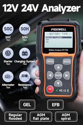 Pro-level All in One Car Battery Tester – The FOXWELL BT705 is backed by 14+ years of automotive expertise and a dedicated support team. It delivers professional analysis for 12V & 24V batteries, assessing SOH, SOC, starter, and alternator systems. Compatible with flooded, AGM, spiral, and GEL batteries (100-2000 CCA), it ensures 99.9% accuracy with upgraded copper clamps, secure clip-on leads, and advanced conductance technology.