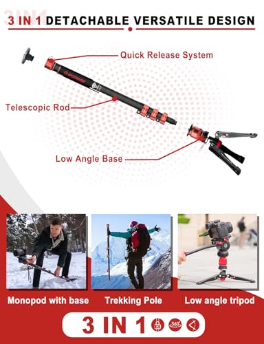 ⭐【 Versatile 3-in-1 with Detachable Tripod Base】:The base serves as a tabletop mini tripod or low-profile base; the pole can be used as a stabilizer extension or hiking stick, offering multifunctional utility