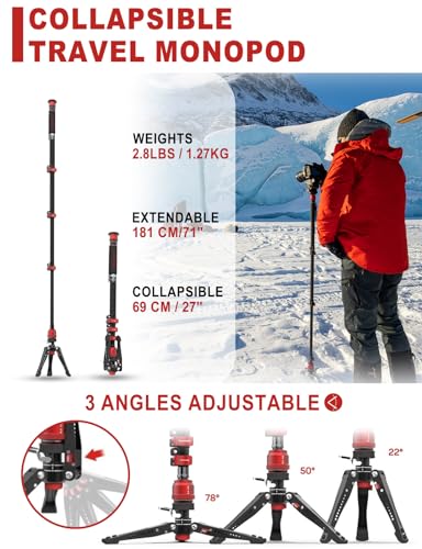 ⭐【Lightweight Carbon Fiber Monopod】: Made of carbon fiber, this monopod is light in weight; It weights only 2.8 lbs, payload 17.64 lbs(for verticle); Working height 5.9-71inchs; Collapsed length in 27 inch, effortless to take it to anywhere(Carry bag included).