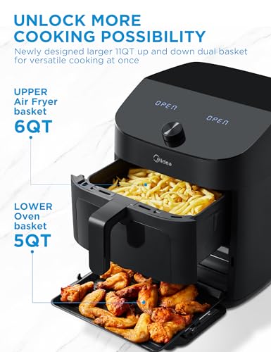 Midea Dual Basket Air Fryer Oven 11 Quart 8 in 1 Functions, Clear Window, Smart Sync Finish, Works with Alexa, Wi-Fi Connectivity, 50+ App Recipes for family meals, Bake, Roast, Grill, Broil, Toast