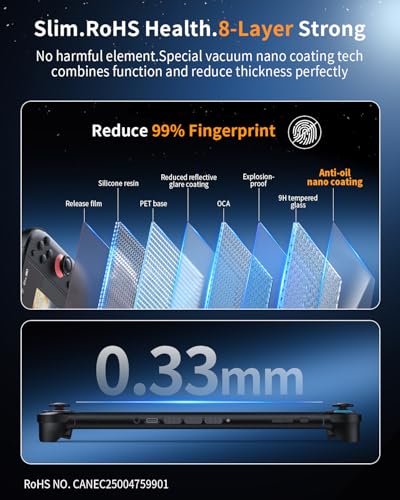 【0.33 mm Slim Sensitive】 With 8 layer different material and nano coating, the switch 2 screen film combines protection and sensitivity perfectly. Reduce 99% fingerprint, no delay and dock friendly thanks to anti-oil nano vacuum and leaf bionic tech.