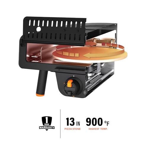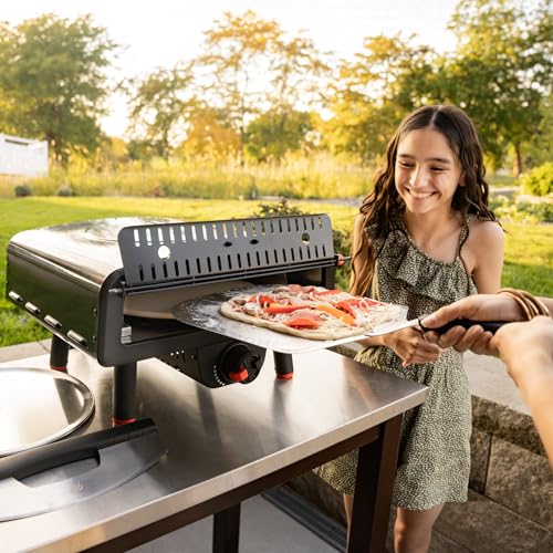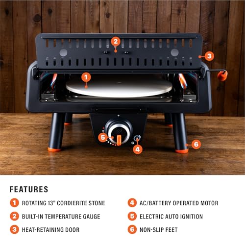 Enjoy endless pizza creation with this Blackstone Tabletop Pizza Oven. This pizza oven’s portable size makes it ideal for moving around your backyard, taking with you on outside adventures, or keeping in a smaller outside kitchen space. Make up to 13” pizzas at the 13” rotating cordierite pizza stone that may be equipped with a start and stop button so you’ll easily cook your pizza to perfection without manually rotating it. Ensure your pizza is cooked just how you find it irresistible with the built-in temperature gauge, temperature keep an eye on knob, and a functional utility door. Enjoy making your favorite classic pizzas or mixing it up with new creations in this portable and efficient Blackstone Tabletop Pizza Oven.