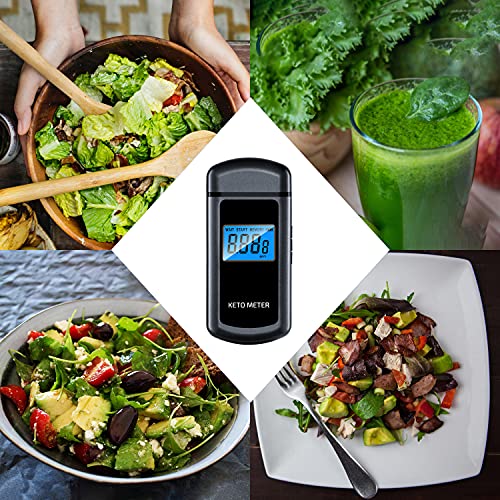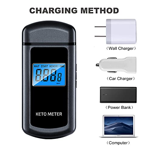 Breath ketone analyzer detects your breath acetone from 0 to 99 PPM and follow 6 level guidance: 0.0-1.9ppm (No ketosis), 2.0-3.9ppm (Early Stage Ketosis), 4.0-9.9ppm (Light Ketosis), 10-39ppm (Stable Fat Burning Zone), 40-59ppm (Caution-High Ketosis), 60-99ppm (Ketoacidosis); Tracking breath acetone is a better measure of what your body is actually using for fuel because acetone in our breath is an actual byproduct of fat burning, and 80% of fat that we burn leaves the body through the lungs