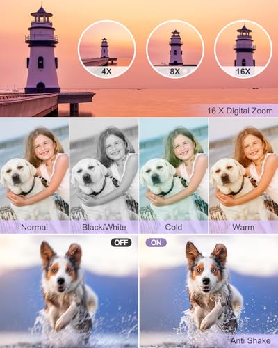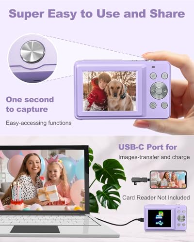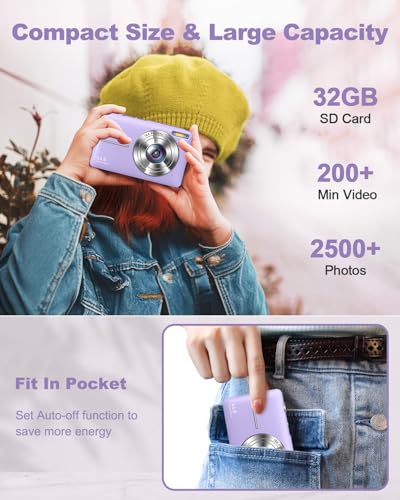Digital Camera Small Camera for Photography Digital Point and Shoot Cameras with FHD 1080P, 32GB Card, 16X Zoom Anti Shake Kids Camera, Purple