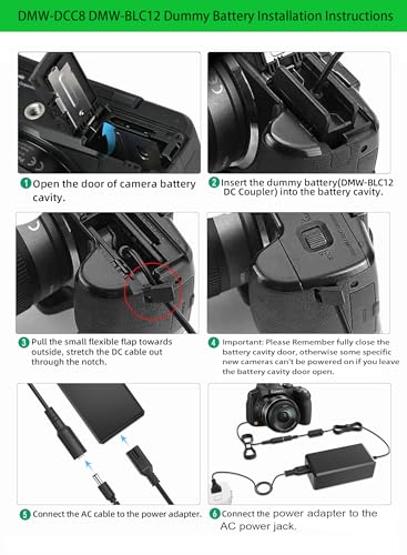 [Product Feature:] This DMW-DCC8 DC coupler replacement for Panasonic original DMW-BLC12 DMW-BLC12E DMW-BLC12PP camera battery, connection DMW-AC8 /DMW-AC10 ac power adapter supply continuously charge for your camera. Implement for lengthy studio shoots with no need to continuously replace and recharge multiple batteries.
