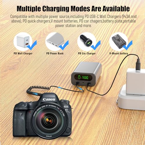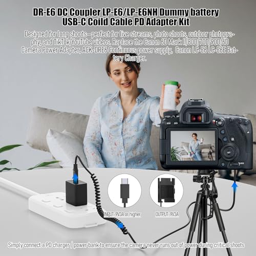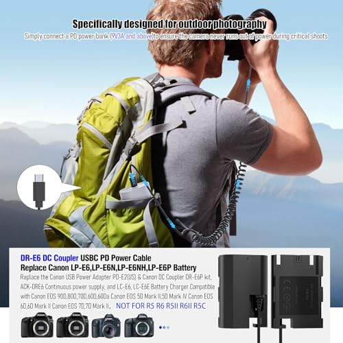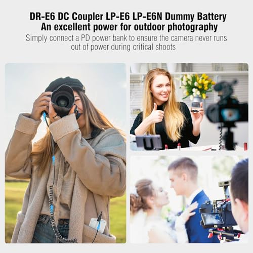 Continuous Power Supply: Use the DR-E6 dummy battery power adapter PD Cable to provide uninterrupted power to your camera. This eliminates the need for the Canon LC-E6 Battery Charger and frequent LP-E6 battery changes, enabling extended shooting sessions.