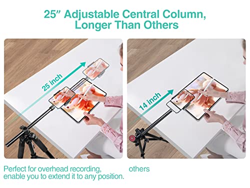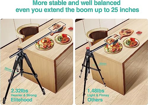 [Ultra-stable for Overhead Recording] Heavy Duty aluminum tripod (weighted: 2.2lbs) is adopted to construct this overhead iPhone tripod, it keep stable and well balanced even you extend the boom up to 25 inches and holding a heavy phone such as iPhone 14 13 12 Pro Max. It is your workspace, desks and kitchen counters ideal partner for live videos, cooking videos, taking pictures and more.