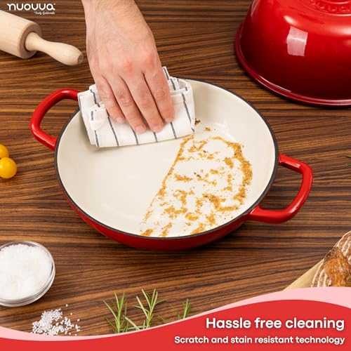 ENAMELLED FINISH: The enamelled surface of the cast iron dutch oven pot by Nuovva is non-reactive, making it safe for all types of dough and ingredients. It resists rust and scratches, ensuring your pot remains in pristine condition for years. The smooth enamelled finish makes cleaning effortless!