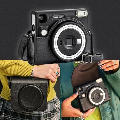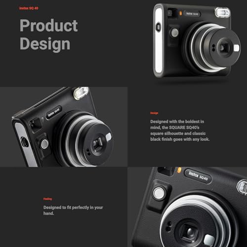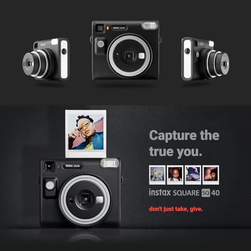 Fujifilm INSTAX SQUARE SQ40 instant camera, a chic instant camera featuring a sophisticated design with a textured sleek retro black finish that’ll go with any style. And it’s remarkably easy to operate, helping you capture beautiful INSTAX SQUARE instant photos, every time. Plus, by making the INSTAX SQUARE SQ40 camera wonderfully versatile, it’s always ready for all your creative moments. Simply twist to turn on, twist to enter Selfie mode and twist to turn off. And with automatic exposure, expressing your creativity really couldn’t be easier; whether you’re behind the camera or framing yourself in the selfie mirror ready for a close-up. Just point and shoot and let the INSTAX SQUARE SQ40 camera do the rest. The SQUARE SQ40 incorporates a Fujinon 65.75mm f/12.6 lens and produces 2.4″ x 2.4″ square prints.