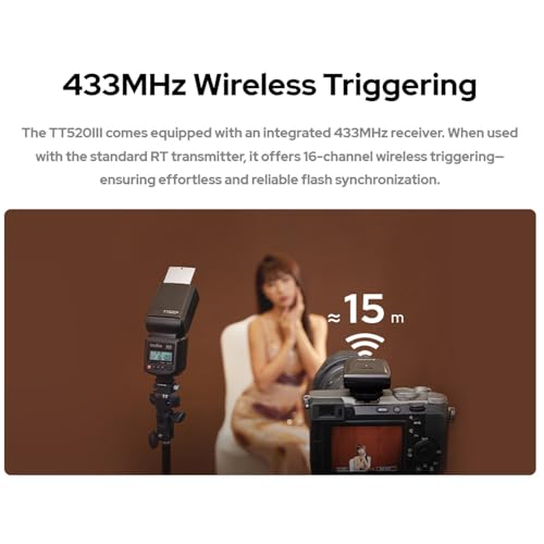 433MHz Wireless Triggering: The TT520III comes equipped with an integrated 433MHz receiver. When used with the standard RT transmitter, it offers 16-channel wireless triggering-ensuring effortless and reliable flash synchronization.