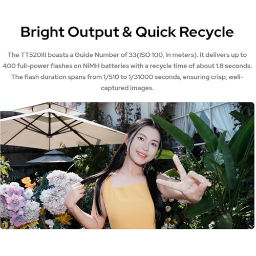 Bright Output & Quick Recycle: The TT520III boasts a Guide Number of 33(ISO 100, in meters). It delivers up to 400 full-powerflashes on NiMH batteries with a recycle time of about 1.8 seconds.The flash duration spans from 1/510 to 1/31000 seconds, ensuring crisp, well-captured images.
