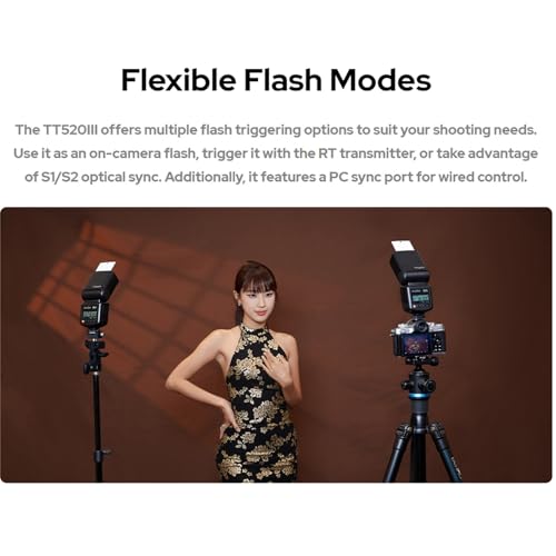 Flexible Flash Modes: The TT520III offers multiple flash triggering options to suit your shooting needs. Use it as an on-camera flash, trigger it with the RT transmitter, or take advantage of S1/s2 optical sync. Additionally, it features a PC sync portfor wired control.