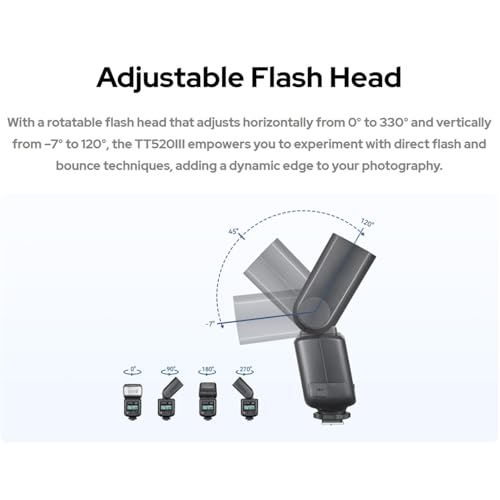 Adjustable Flash Head: With a rotatable flash head that adjusts horizontally from 0° to 330° and vertically from -7° to 120°,the TT520III empowers you to experiment with direct flash and bounce techniques, adding a dynamic edge to your photography.