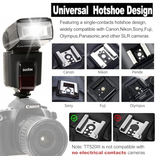 【433MHz Wireless Triggering & Flexibility】–Godox TT520III Flash for camera built-in 433MHz receiver,TT520III flash with transmitter across 16 channels within 15m.Featuring a single contact hotshoe design,widely compatible with Canon,Sony,Nikon,Fujifilm,Panasonic,Olympus DSLR Cameras