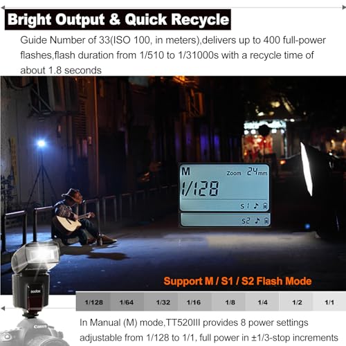 【Bright Output & Quick Recycle】–GN33 TT520III Godox flash for Nikon,flash duration from 1/510 to 1/31000s,with 8 levels of power output control, flash output from 1/128 to 1/1,delivers up to 400 full-power flashes with a recycle time of about 1.8 seconds