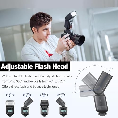 【Rotatable Head & Creative Modifiers】–With a rotatable flash head that adjusts horizontally from 0° to 330° and vertically from –7° to 120°.Compatibility with Godox AK-R1 magnetic modifiers (via optional S-R1/S-R2 adapter) and Bowens mount softboxes,reflectors,etc accessories(via optional S/S2 flash bracket)