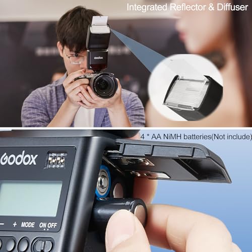 【Easy & Pro Performance Godox Flash】–The upgraded LCD screen simplifies settings navigation,built-in wide-angle diffuser and reflector,with internal battery compartment accepts 4 AA NiMH batteries,only 304g lightweight design,ensures effortless handling while delivering professional-grade lighting for daily creative projects