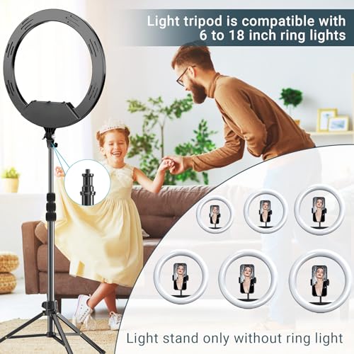 【Sturdy&Stable】Despite the fact that the light stand is lightweight, it is vitally strong and also made of aluminum alloy. With its load capacity of 1.5kg and its legs equipped with soft and durable non-slip rubber, it supports most ring lights from 6″ to 18”