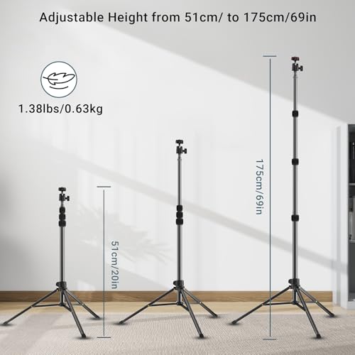 【Adjustable Height】The adjustable height of the tripod ranges from 20in/51cm to 69in/175cm. You can adjust the height flexibly according to the shooting. Whether you need a low-angle shot or a high-angle view, the stand can be easily adjusted to meet your needs