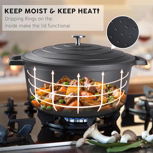 Rapid Heat Distribution and Longer Heat Preservation-This 5QT Dutch oven is a perfect size for circle of relatives meals, the tight-fitting lid with raised nodes will lock the flavor and moisture perfectly. this new pot will distribute heat evenly and keep meals warmer for longer time. It works well from refrigerator to stove top or oven to the table, temperatures up to 500 degrees Fahrenheit.