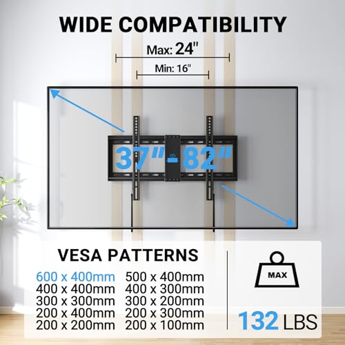 Widely applicable: This Fixed TV wall mount is designed for 32″ – 82″ TVs and is rated for TVs up to 132lbs / 60 kg. Our fixed TV mount has a compatible faceplate that fits VESA 200X100mm (8″x4″) 200X200mm (8″x8″) 300X200mm (12″x8″) 300X300mm (12″x12″) 400X300mm (16″x12″) 400X400mm (16″x16″) 600 x 400 mm(23. 6″x16″) . Please check VESA ( Mounting hole pattern on the back of TV and please be noticed that it can’t fit 100x100mm), TV weight, wall stud location and possible blocked cable/input