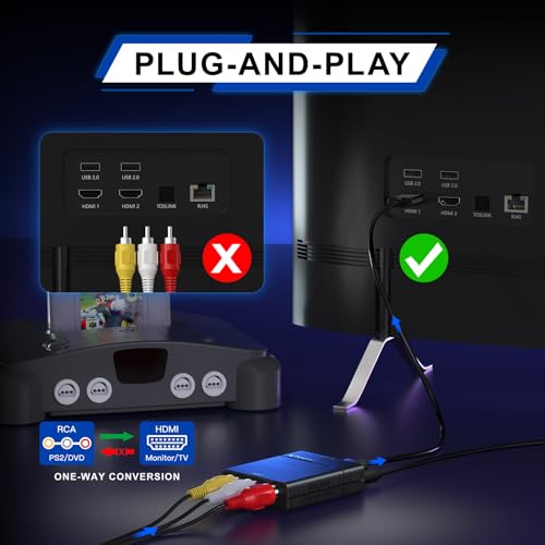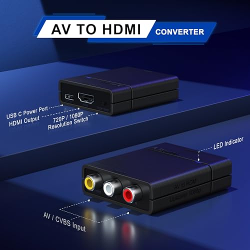 【RCA to HDMI Converter】This AV to HDMI converter converts analog RCA/AV/CVBS Composite (Yellow, White, Red) and R/L input video and audio into HDMI monitor/display. Note: For one way conversion only, supports RCA to HDMI only, doesn’t support HDMI to RCA