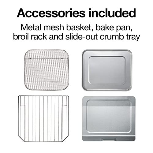 INCLUDES MESH BASKET FOR AIR FRYING, BAKE PAN AND BROIL RACK: The air fryer oven comes with the whole thing needed to air fry, bake, broil and toast, plus a slide-out crumb tray. Mesh basket fits at the upper oven rack with bake pan below to catch drippings.