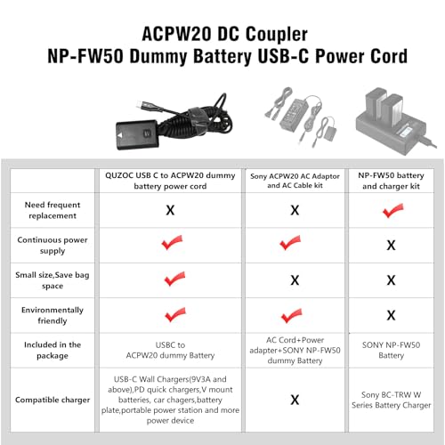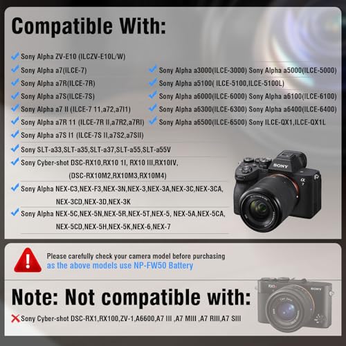Versatile Compatibility: This NP-FW50 power adapter is designed to be compatible with:Sony RX10IV(DSC-RX10M4),A6400( ILCE-6400/α6400)/ILCE-6400L,A6000(ILCE-6000/α6000),A5100(ILCE-5100L/A5100L/α5100/ILCE-5100Y/A5100Y),A7 II (ILCE-7M2/A7M2/α7 II)a7IIK,A7R II (ILCE-7RM2/A7RM2),A5000(ILCE-5000/α5000),A6300,A6100,A6300,NEX-5R/NEX-5RK/B,Alpha a7, a7R, a7S series, ZV-E10, RX10,RX10IV series, NEX series, and SLT-A series,among others.