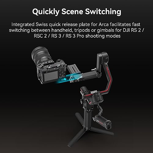 Integrated Swiss Plate for Arca: Integrated Swiss quick release plate for Arca facilitates fast switching between handheld, tripods or gimbals for DJI RS 2 / RSC 2 / RS 3 / RS 3 Pro shooting modes.