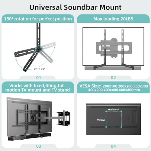 Universal Compatibility:The HCMOUNTING soundbar mount supports soundbars up to 20 lbs (9 kg) and is compatible with popular brands like Samsung, Sony, Vizio, Bose, and Yamaha. It fits TVs with VESA patterns from 75x75mm to 600x400mm and works with fixed, tilt, and full-motion wall mounts.