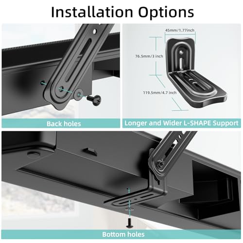 Flexible Mounting Options:The detachable long extension plates provide up to 180° swivel, offering more flexibility than traditional fixed brackets. This design allows you to position your soundbar above or below your TV, perfect for various room layouts and corner installations.