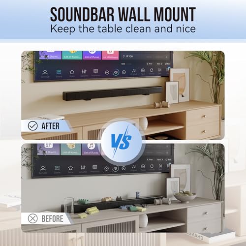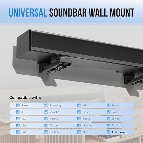 UNIVERSAL SOUNDBAR MOUNT: Mount your soundbar to the wall with the sound bar mounts, free up your desk space. The Sound bar mount fits for Samsung, Sony, Bose, LG, Vizio, Onn, TCL, Yamaha, JBL, Polk, Roku, Sonos, Denon, Klipsch, Majority, Panasonic, Hisense Soundbar and more.