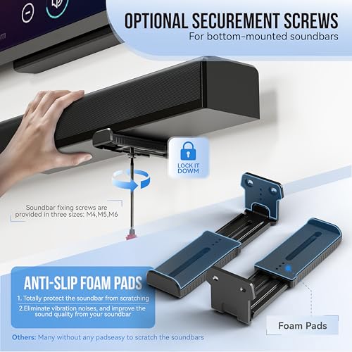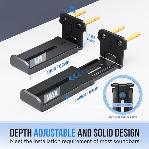 ADJUSTABLE DEPTH: You can easily adjust the depth through the locking knob under the sound bar shelf according to the thickness of the soundbar. The soundbar mounting bracket under TV can be adjusted the depth from 3.7” to 6.4” for Dolby Atmos soundbars