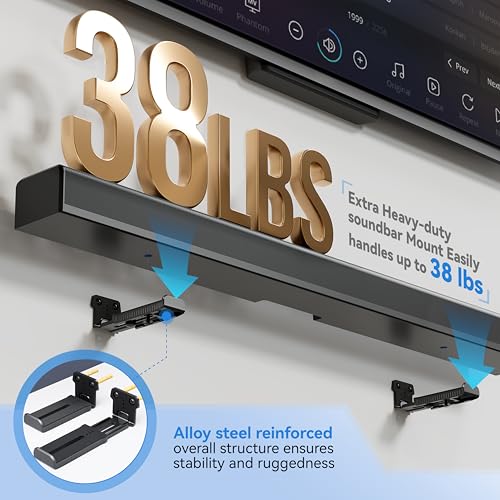 SOLID AS ROCK: The soundbar wall mount is made of thickened and hardened high-quality steel, which can easily support soundbars weighing up to 38 lbs/17 kg.