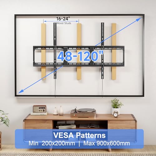 Compatible with most 48″-120″ flat/curved TVs (OLED/LCD/LED/Plasma), supporting VESA up to 900x600mm (35.4″x23.6″). Always verify your TV’s VESA pattern, weight, stud spacing, and input clearance before purchase.