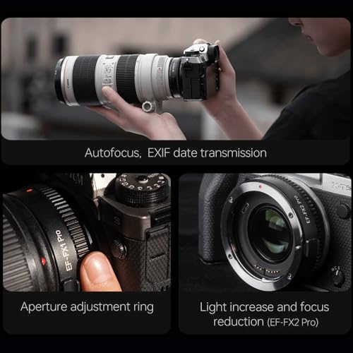 【Compatible Model】VILTROX EF-FX2 Pro mount adapter is compatible with Canon EF lenses to be mounted on Fujifilm X-mount mirrorless cameras like X-H1,X-H2,X-H2S,X-PRO2,X-T2,X-T3, X-T1,X-T20,X-T10,X-E2, X-E1,X-T2X, X-T100 X-PRO2 X-E3 X-A20 X-A5 and more